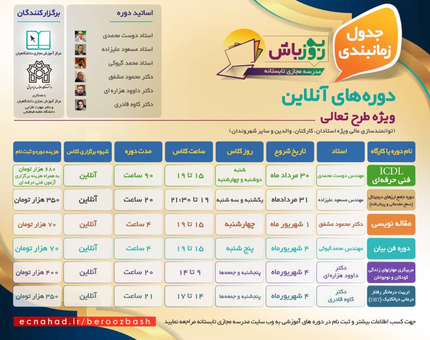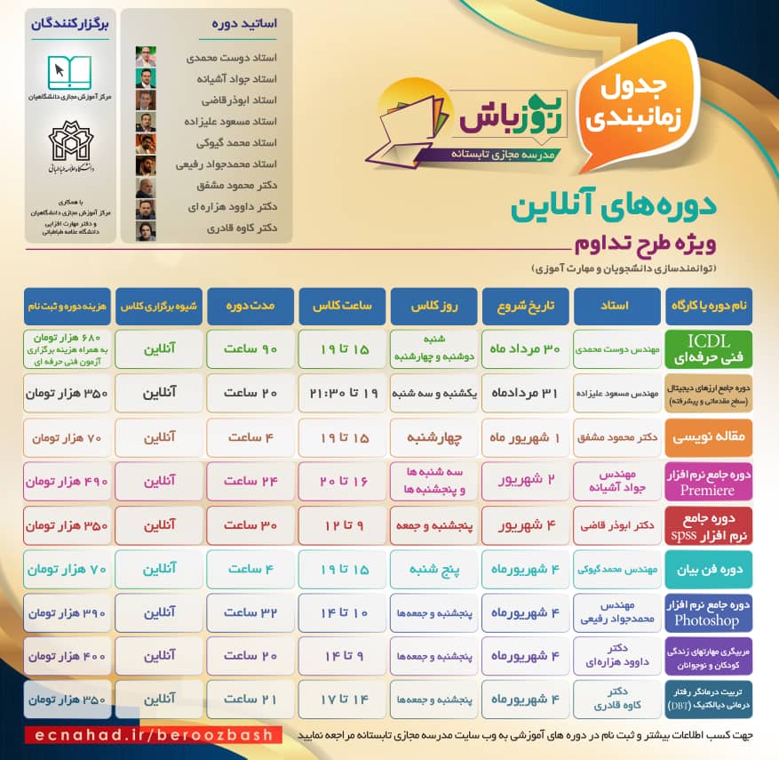 در مدرسه مجازي تابستانه "به روز باش" دورههاي كاربردي و مهارتي مانند «مربیگری مهارتهاي زندگي كودك و نوجوان، تربيت درمانگر (رفتاردرماني ديالكتيك)، مدیریت هیجان، فن بيان، مدیریت رفتار در فضای مجازی، مهارت مثبتاندیشی، مهارت تفکر انتقادی، رابطۀ بین فردی در ایام کرونا، چگونه مادری شایسته باشیم؟، مديريت استرس، مقاله نویسی در مجلات خارجی» و دورههاي ويژه كارآفرينی و اشتغال دانشجويان و جوانان مثل «دوره جامع ارزهایی دیجیتال(سطح مقدماتی و پيشرفته)، آموزش نرمافزار پریمیر، آموزش نرمافزار فتوشاپ، آموزش نرمافزار تحليل دادههای آماری با SPSS، آموزش ICDL و دوره مقاله نويسی» برگزار میشود.